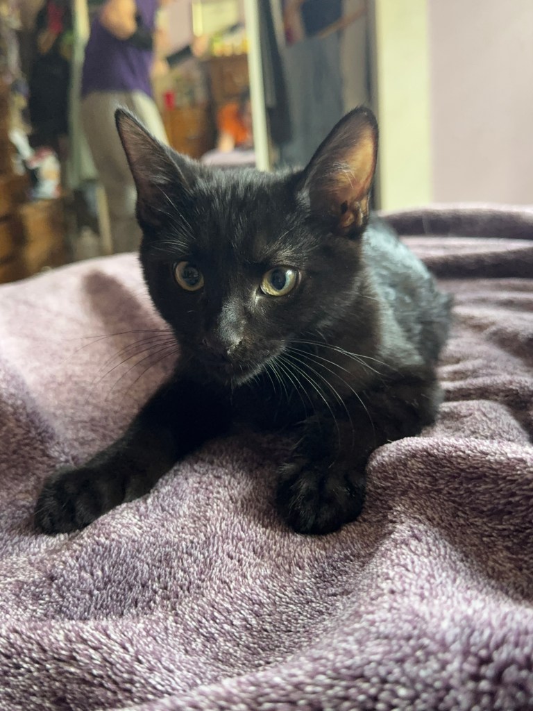 Hi! My name is Prince! I am a male all black 3 month old kitten! I can be shy at first but I am a total charmer and love bug when given the chance! I also love snuggles!