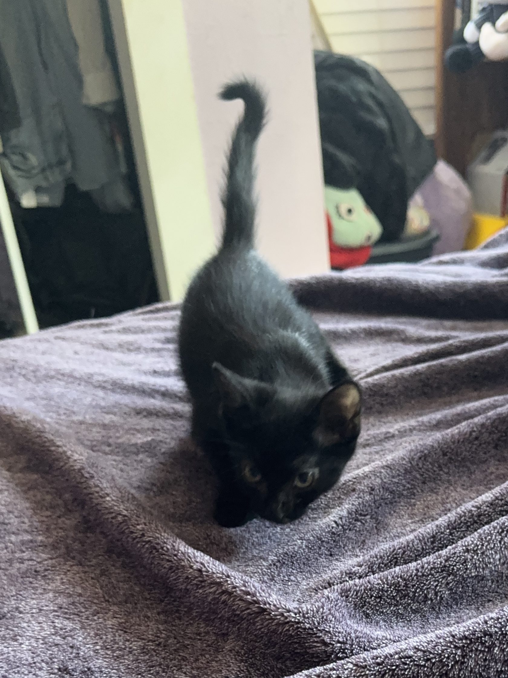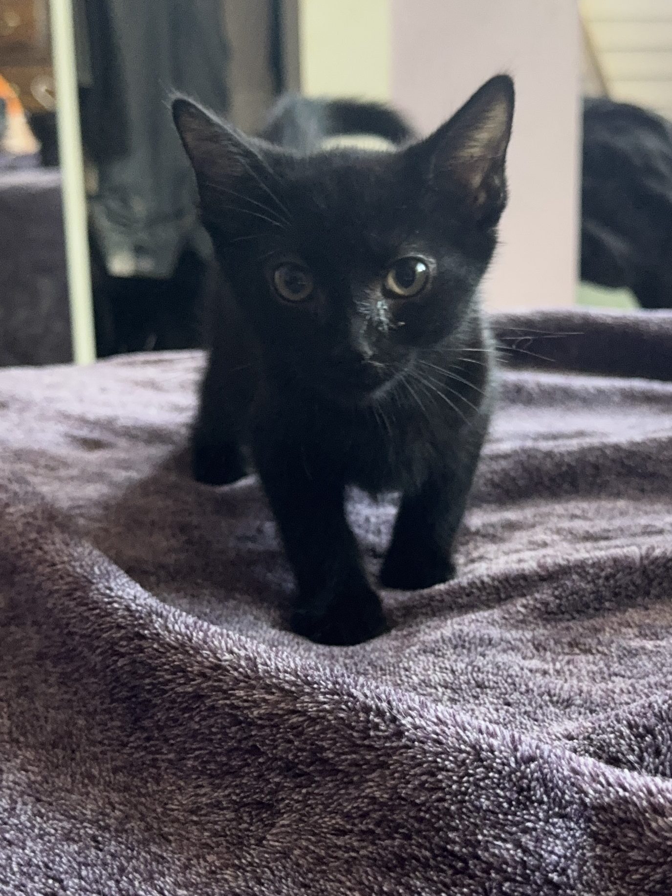 I am the smallest girl of the litter and only 2 months old! Don’t let the superstition of a black cat bother you! I am a snuggle bug and can be very independent but will come at the sound of a can opening!